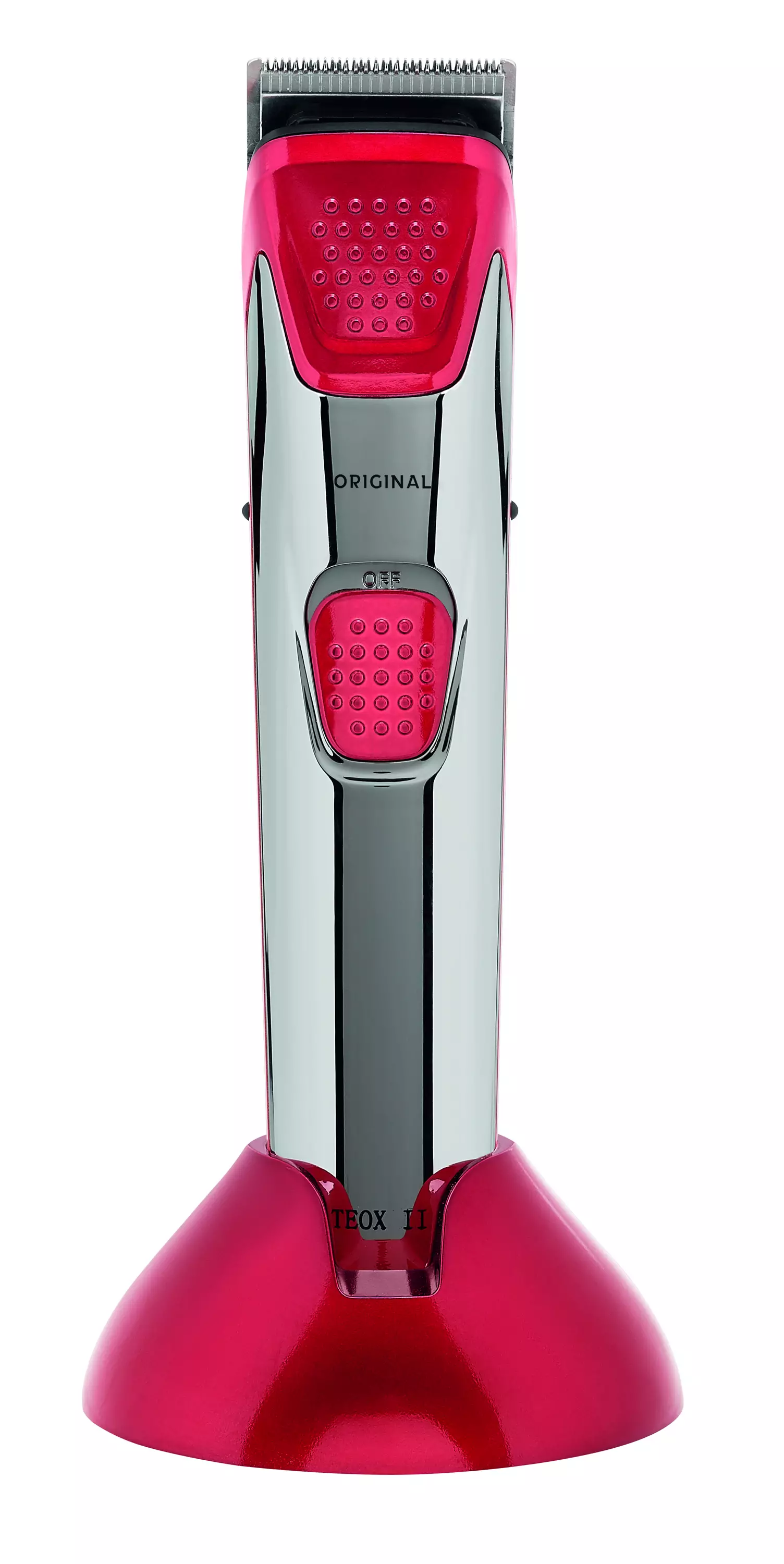 Trimmeri. Teox II trimmerin leikkuuterät ovat ruostumatonta terästä, joten sen käyttöikä on erittäin pitkä. Teox trimmerin erikoisin ominaisuus on säädettävä tallakiinnitys, pyörivällä valitsimella. Trimmeriä on helppo käyttää ja siinä on käytettävissä paljon asetuksia.U-mallinen terä 60-61 HRC kovuusNi-MH akkutallat 1,5-8 mmleikkauspituus 0,3 mmvedenpitävä IPX6johdotonlataus USB-liittimellälatausaika 120 minkäyttöaika 150 minsäilytysteline, pieni kampa, öljy, puhdistusharja, talla. Laitevalmistajan takuu 6kk.