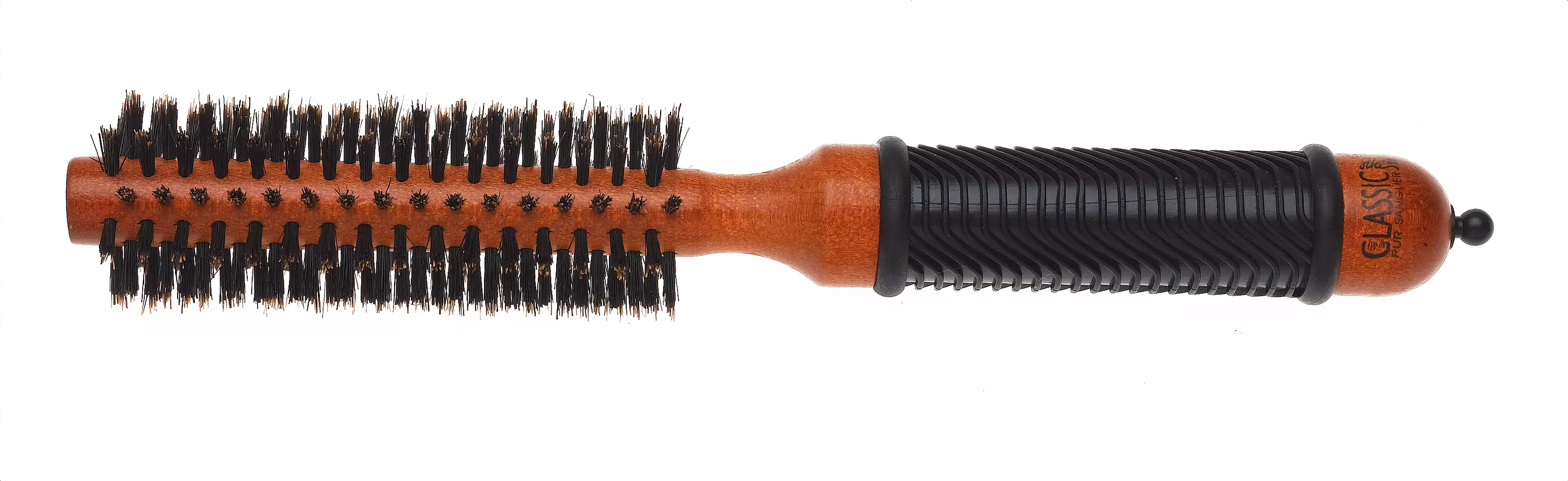 Pyöröharja villisian harjaksilla ohuille ja normaaleille hiuksille. Villisian harjakset stimuloivat hiuspohjan öljyjä, mikä tuo hiuksiin kiiltoa. Puinen harja ei kestä lämpöä, halkaisija 40mm.