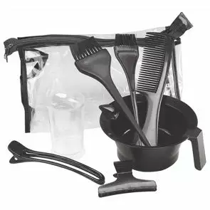 Paketti sisältää värjäyskulhon (250ml), 2 värisutia, joissa nailonharjakset, 2 klipsiä, 1 kampa, 1 mittakuppi ja muovinen säilytys pussukka.