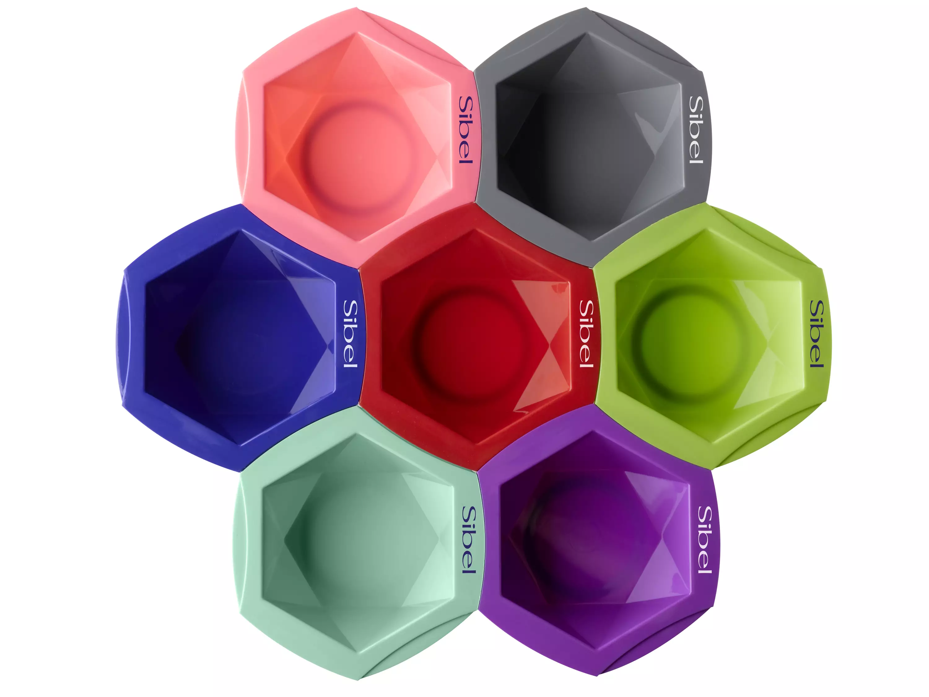 Seitsemän toisiinsa kiinnitettävää ja pinottavaa värikuppia. Mahdollistaa yhden paletin luomisen seitsemästä yhteen napsautettavasta kulhosta, ihanteellinen monisävyisiin värjäystekniikoihin.
