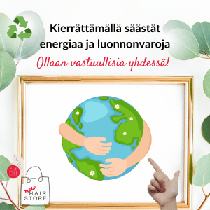 Välitämme maapallon tulevaisuudesta ja huomioimme ympäristöä monin eri tavoin. Verkkokaupan varastossa kierrätämme pakkausmateriaalit oikeaoppisesti ja huomioimme sähkön- sekä vedenkulutusta. Löydät niin verkkokaupastamme kuin liikkeistämme vähemmän luontoa kuormittavat hiustenhoitotuotteet. Kannetaan vastuu yhdessä ja kannustetaan muitakin toimimaan ekologisesti.