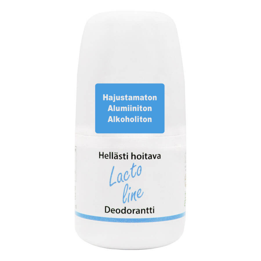 Lacto line sarjan deodorantti sopii herkälle iholle. Estää tehokkaasti hien hajua ja pitää olon raikkaana koko päivän. Ei sisällä etyylialkoholia eikä alumiinia. Hajustamaton. Käyttö; Levitä puhtaalle ja kuivalle iholle. Ei tahmaa.