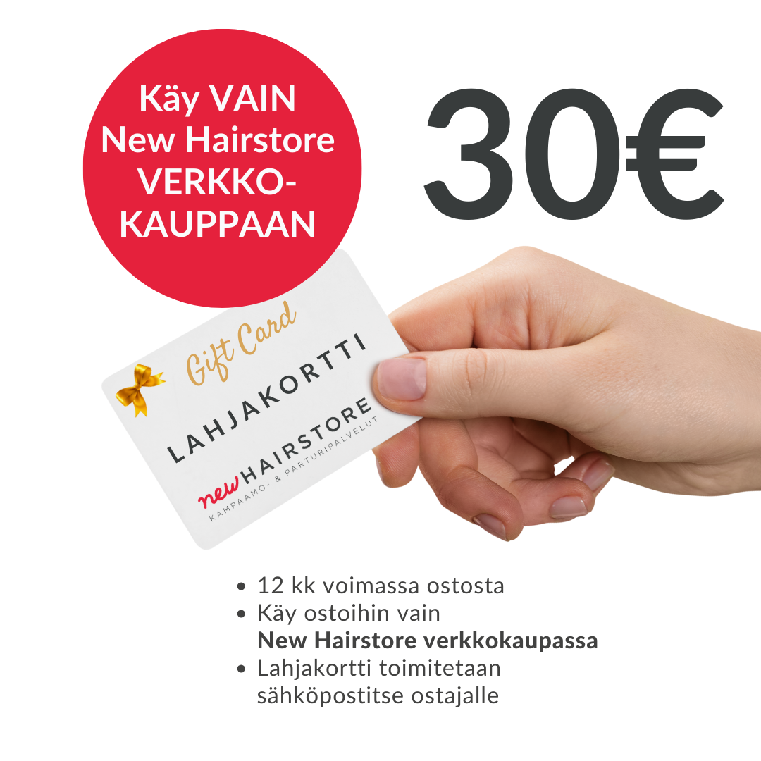 New Hairstore verkkokaupan lahjakortti. HUOM! KÄY VAIN VERKKOKAUPASSA! Lahjakortin summa on käytettävä kerralla.