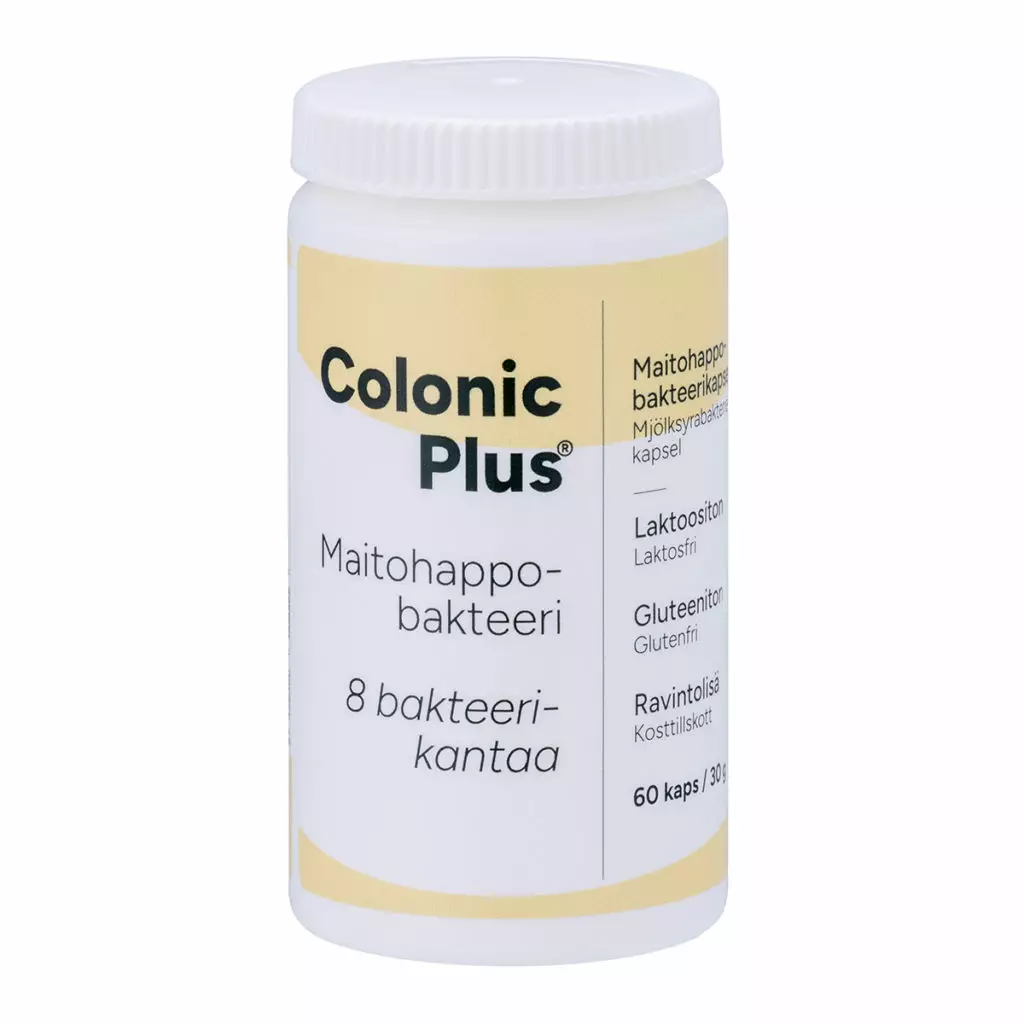 Ainesosat Ainesosat vuorokausiannoksessa (1-3 kaps.): Inuliinia 383–1148 mg Liivatetta (kapselin kuori, naudasta) Maitohappobakteeriseosta, jossa valmistushetkellä yhteensä vähintään miljardi (1,0 x 10^9) maitohappobakteeria/kapseli seuraavia kantoja: Bifidobacterium bifidum Lactobacillus acidophilus Lactobacillus casei Lactobacillus plantarum Lactobacillus rhamnosus Bifidobacterium lactis Streptococcus thermophilus Bifidobacterium longum Pintakäsittelyainetta E 470b Saattaa sisältää pieniä määriä soijan ja maidon jäämiä. Annostus Aikuiset 1-3 kapselia, lapset yli 2 v. 1 kapseli päivässä. Säilytetään huoneenlämmössä kansi hyvin suljettuna. Ravintolisä ei korvaa monipuolista ja tasapainoista ruokavaliota eikä terveitä elämäntapoja. Pakkauskoko 60 kaps./30 g Lisätietoa Colonic Plus ® Maitohappobakteerikapselit sisältävät kahdeksaa laktoositonta enteropäällystettyä maitohappobakteerikantaa. Enteropäällystetty tarkoittaa, että maitohappobakteerit on suojattu kestämään mahalaukun happamuuden, jolloin ne kulkeutuvat vahingoittumattomina suolistoon saakka. Colonic Plus® Maitohappobakteerikapselit sisältävät myös inuliinia. Inuliini on sikurijuuresta (Cichorium intybus) valmistettu prebiootti. Inuliini on luonnon keino varastoida energiaa lähes kalorittomaan muotoon, jonka vain suoliston hyötybakteerit kykenevät käyttämään.