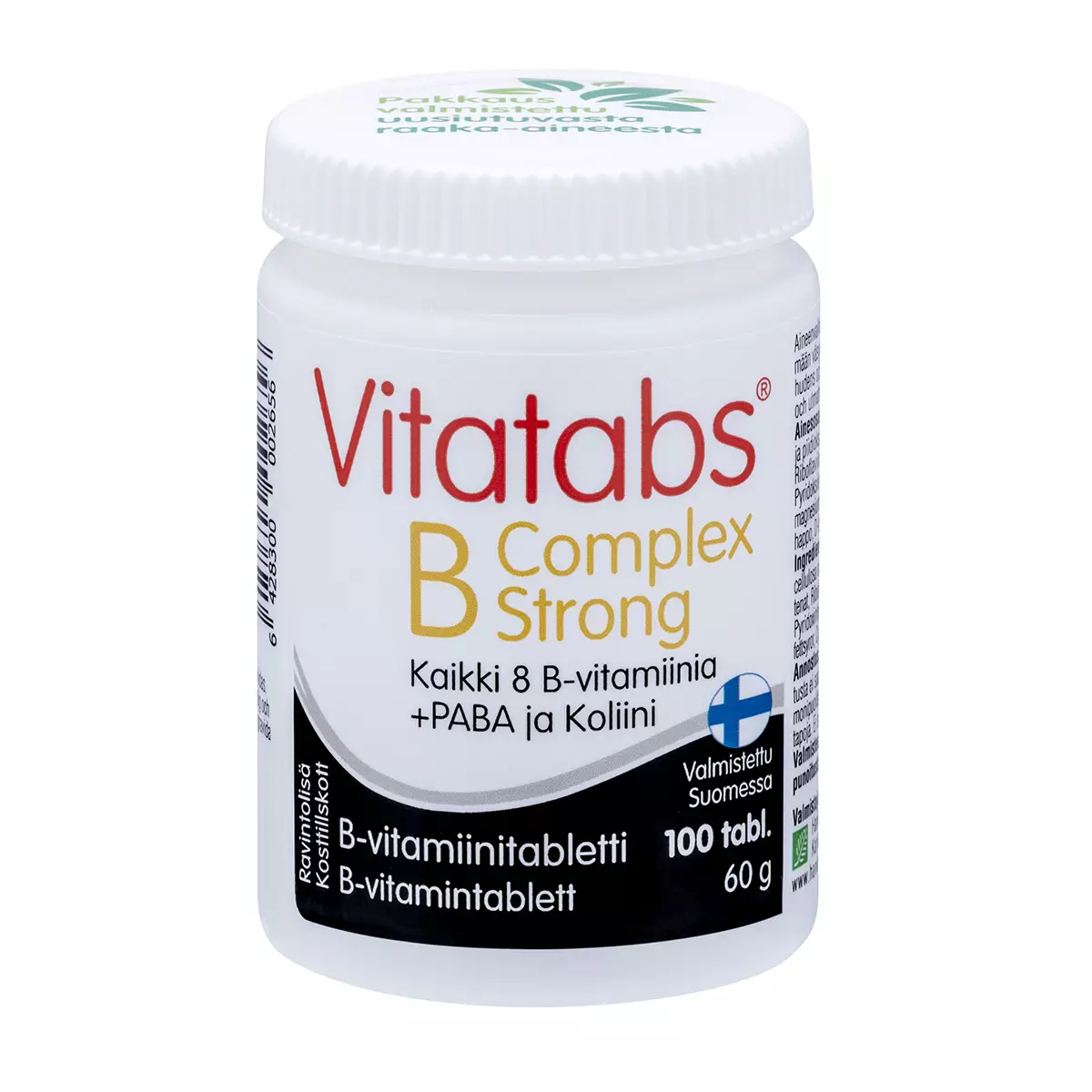 Ainesosat Paakkuuntumisenestoaine mikrokiteinen selluloosa ja piidioksidi, Tiamiinimononitraatti, Kalsium-D-pantotenaatti, Riboflaviini, Nikotiiniamidi, Para-aminobentsoehappo, VitaCholine® koliinibitartraatti, Pyridoksiinihydrokloridi, Pintakäsittelyaine rasvahappojen magnesiumsuolat, Syanokobalamiini, Pteroyylimonoglutamiinihappo, D-biotiini Vuorokausiannos Vuorokausiannos 1 tabl. sisältää: B1-vitamiinia 50 mg (4545 %)* Pantoteenihappoa (B5) 50 mg (833 %)* B2-vitamiinia 50 mg (3571 %)* B12-vitamiinia 50 µg (2000 %)* Niasiinia (B3) 50 mg (313 %)* Para-aminobentsoehappoa 50 mg Koliinia 20 mg B6-vitamiinia 12 mg (857 %)* Foolihappoa 400 µg (200 %)* Biotiinia 600 µg (1200 %)* *vuorokautisen saannin vertailuarvosta Annostus 1 tabletti päivässä. Ei suositella raskaana oleville eikä imettäville. Valmisteen niasiini voi aiheuttaa ohimenevää ihon punoitusta pian käytön jälkeen. Ravintolisä ei korvaa monipuolista ja tasapainoista ruokavaliota eikä terveitä elämäntapoja. Säilytys: Huoneenlämmössä (15-25 °C), tiiviisti suljettuna ja suojattuna auringonvalolta ja kosteudelta. Valmistettu Suomessa Pakkauskoko 100 tabl./60 g Lisätietoa Vitatabs® B-Complex Strong –valmiste sisältää kaikkia kahdeksaa B-ryhmän vitamiinia sekä koliinia ja para-aminobentsoehappoa eli PABAa. Vesiliukoisia B-vitamiineja tarvitaan päivittäin kehon normaalin toiminnan ylläpitämiseen. Aineenvaihduntaan vaikuttavat mm. biotiini, B1-, B2-, B6– ja B12-vitamiinit. Hermostolle ovat tärkeitä erityisesti biotiini sekä B1– ja B12-vitamiinit, jotka yhdessä foolihapon sekä B2– ja B6-vitamiinin kanssa auttavat vähentämään väsymystä ja uupumusta. Ihon ja limakalvojen kuntoon vaikuttavat biotiini ja B2-vitamiini, hormonitoimintoihin puolestaan B6-vitamiini. B1-vitamiini edistää sydämen normaalia toimintaa Vastustuskyvylle tarvitaan B6– ja B12-vitamiinia sekä foolihappoa. Punasolujen muodostumiselle tärkeitä ovat B2-, B6– ja B12-vitamiini sekä foolihappo. Normaalia homokysteiinin aineenvaihduntaa edistävät B6– ja B12-vitamiini, foolihappo ja koliini. Koliini edistää myös normaalia rasva-aineenvaihduntaa ja maksan toiminnan pysymistä normaalina.