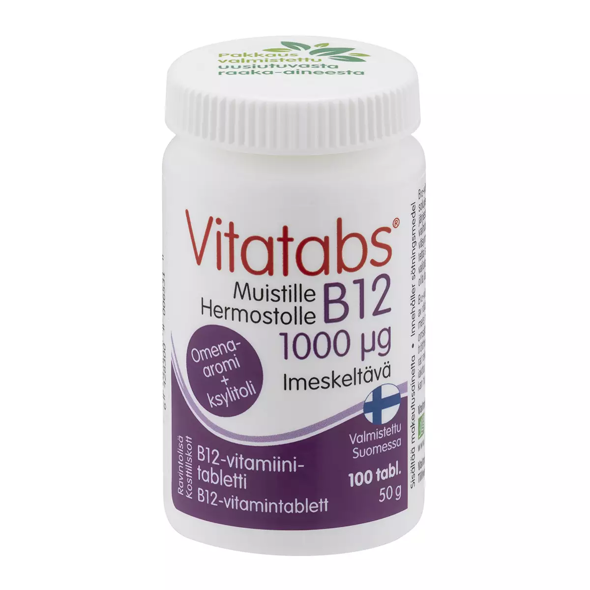 B12-vitamiinitabletit. Ravintolisä. B12-vitamiini tukee hermoston hyvinvointia. Imeskeltävä omenan makuinen tabletti, sisältää ksylitolia. Laktoositon, hiivaton, gluteeniton ja vegaaninen.