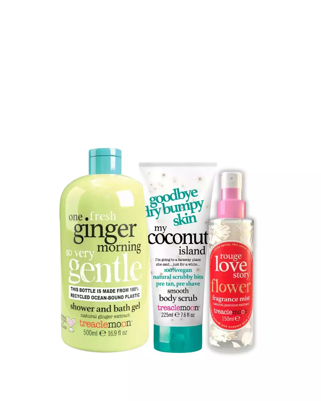 1. Treaclemoon One Ginger Morning Shower Gel 500ml - Herkullisen tuoksuiset Treaclemoon suihkugeelit ihastuttavat tuoksuillaan ja teemoillaan. Yli 92% biohajoavat tuotteet hemmottelevat ihoasi ympäristöä kunnioittaen. Tuotteet ovat vegaanisia ja sisältävät 100% luonnollisia uutteita. 2. Treaclemoon My Coconut Island Body Scrub 225ml - Ihanan pehmeä ja sileä iho. Pehmeät ja hellävaraiset vartalokuorinnat lumoavilla ja tunnelmallisilla tuoksuilla tekevät ihosta silkin sileän. Treaclemoon kuorintatuotteet sekä näyttävät että tuntuvat ihanilta ja sopivat herkällekin iholle. Todellista hemmottelua parhaimpiin suihku- ja kylpyhetkiin! Vegaaninen. 3. Treaclemoon Rouge Love Story Body Spray 150ml - Vartalosuihke kietoo vartalosi tuoksulla, joka on vähän makea ja vähän tulinen. Tuoksu on kuin kävelisit itämaisessa puutarhassa, joka on täynnä ambraa ja lempää jasmiinia. Sisältää luonnollista jasmiiniöljyä. Vartalotuoksu on vegaaninen.