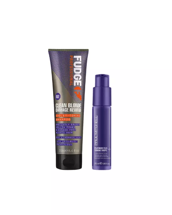 1. Fudge Clean Blonde DAMAGE Rewind Violet Toning Shampoo 250ml - Shampoo on runsaspigmenttinen shampoo, joka sisältää violetteja pigmenttejä. Ne ehkäisevät ei-toivottuja keltaisen sävyjä vaaleissa hiuksissa. Lisäksi shampoo korjaa vaurioituneita hiuksia tehokkaasti. Saat vahvemmat ja terveemmät hiukset, jotka säilyttävät kauniin viileän, vaalean sävynsä pitkään. 2. Paul Mitchell Platinum Plus Toning Drops 25ml - Lisää suosikkituotteeseen violetti taittopigmentti! Sopii vaaleille, raidoitetuille, harmaille ja hopean sävyisille hiuksille. Lisää mihin tahansa suosikkituotteeseesi violetti, intensiivinen taittopigmentti! Sopii vaaleille, raidoitetuille, harmaille ja hopean sävyisille hiuksille. Tuote sisältää tiivistetyn violettipigmentin, joka viilentää vaalean sävyä. Määritä taittoaste annostelumäärällä. Käyttöohje: Lisää Platinum Plus Purple Toning Drops -sävytippoja mihin tahansa shampooseen, hoitoaineeseen tai tehohoitoon; ja sekoita tuotteet keskenään. Levitä hiuksiin. Huuhtele tai jätä hiuksiin, riippuen käyttämästäsi tuotteesta.