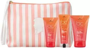 Bonacure Sun Protect on suunniteltu erityisesti auringon, klooriveden ja suolaveden rasittamien hiusten tarpeisiin. Tämä kätevä kolmen tuotteen pakkaus suojaa, puhdistaa ja hoitaa kaikkia hiustyyppejä ennen auringolle altistumista, sen aikana ja sen jälkeen. Tuotteiden vegaaniset koostumukset sisältävät kylmäpuristettua kookosöljyä, joka ravitsee hiuksia, tuo niille kiiltoa ja auttaa säilyttämään hiusvärin kirkkaana. 1. Bonacure Sun Protect 3-in-1 Shampoo 100ml - Sulfaatiton shampoo, joka puhdistaa hiuspohjan, hiukset ja vartalon. Poistaa tehokkaasti aurinkotuotteiden, suolaveden ja kloorin jäämiä, samalla raviten hiuksia. 2. Bonacure Sun Protect 2-in-1 Treatment 75ml - Kosteuttava ja ravitseva hoitoaine, joka tekee hiuksista helpommin hallittavat ja silottaa niitä. Ehkäisee pörröisyyttä ja vähentää katkeilua. 3. Bonacure Sun Protect 10-in-1 Summer Fluid 100ml - Monivaikutteinen jätettävä hoitovoide, joka antaa kosteutta, kiiltoa ja suojaa. Parantaa hiusten hallittavuutta, ehkäisee katkeilua ja pörröisyyttä sekä auttaa säilyttämään hiusvärin.