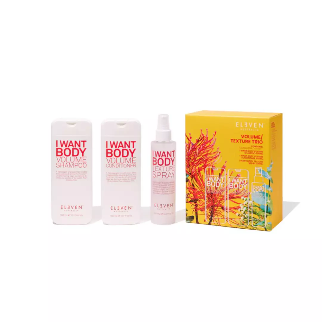 Tuuheuttava ELEVEN Australia VOLUME TEXTURE TRIO. Paketissa: ELEVEN I Want Body Volume Shampoo 300ml, ELEVEN I Want Body Volume Conditioner 300ml ja ELEVEN I want Body Texture Spray 200ml.