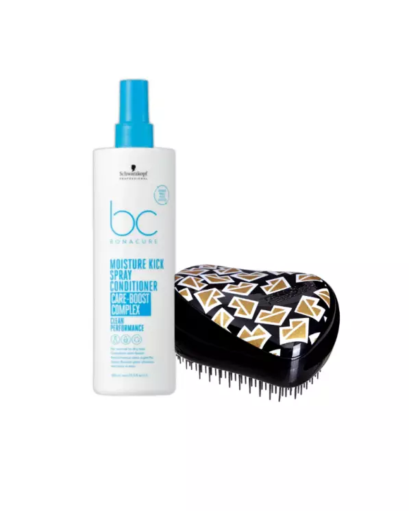 Paketissa: Tangle Teezer Compact - Markus Lupfer ja Bonacure Moisture Kick Spray Conditioner 200ml.