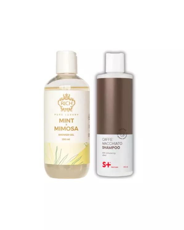 1. S+ Haircare Caffe Macchiato Shampoo 250ml - Kahvi- ja humala-uutteilla rikastettu shampoo stimuloi hiuspohjaa, edistää hiustenkasvua ja ehkäisee hiusten heikkenemistä — samalla kun se puhdistaa hellävaraisesti. 2. Rich Pure Luxury Mint & Mimosa Shower Gel 280ml - Uudista suihkurutiinejasi ja koe ylellinen suihkukokemus Mint & Mimosa- suihkugeelillä.