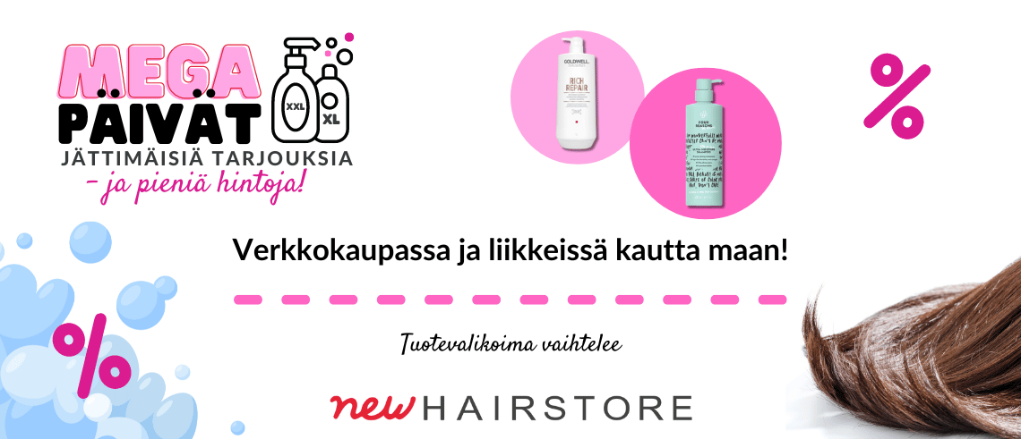 No nyt lähtee! New Hairstoressa on megapäivät! Löydä huippulaatuisia hiustenhoitotuotteita järisyttävän halpaan hintaan! Jättimäisiä tarjouksia - ja pieniä hintoja! Hyvä hiuspäivä kuuluu kaikille. Terveet hiukset kasvavat hyvinvoivasta hiuspohjasta. Siksi valikoimamme on erittäin suuri jotta löydät varmasti oikeat tuotteet sinun hiustarpeisiin.