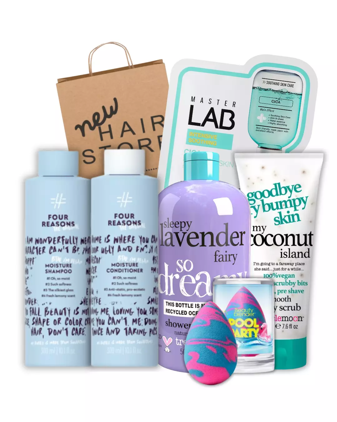 1. Four Reasons Original Moisture Shampoo 300ml - Kosteuttava shampoo. Kuivat hiukset kaipaavat apua sopivan kosteustasapainon säilyttämiseen. Kosteuttava shampoo puhdistaa hellävaraisesti ja tekee hiuksista silkkisen pehmeät sekä kiiltävät. Sisältää kosteuttavista ja hoitavista ominaisuuksistaan tunnettua aloe veraa. 2. Four Reasons Original Moisture Conditioner 300ml - Kosteuttava hoitoaine. Kukapa ei kaipaisi kosteutusta? Kuivat hiukset kaipaavat apua sopivan kosteustasapainon säilyttämiseen. Kosteuttava hoitoaine hoitaa tehokkaasti, poistaa sähköisyyttä ja tekee hiuksista silkkisen pehmeät sekä helposti kammattavat. Sisältää kosteuttavista ja hoitavista ominaisuuksistaan tunnettua aloe veraa. 3. Treaclemoon Sleepy Lavender Fairy Shower Gel 500ml - Herkullisen tuoksuiset Treaclemoon suihkugeelit ihastuttavat tuoksuillaan ja teemoillaan. Yli 92% biohajoavat tuotteet hemmottelevat ihoasi ympäristöä kunnioittaen. Tuotteet ovat vegaanisia ja sisältävät 100% luonnollisia uutteita. 4. Treaclemoon My Coconut Island Body Scrub 225ml - Ihanan pehmeä ja sileä iho. Pehmeät ja hellävaraiset vartalokuorinnat lumoavilla ja tunnelmallisilla tuoksuilla tekevät ihosta silkin sileän. Treaclemoon kuorintatuotteet sekä näyttävät että tuntuvat ihanilta ja sopivat herkällekin iholle. Todellista hemmottelua parhaimpiin suihku- ja kylpyhetkiin! Vegaaninen. 5. Beautyblender Pool Party - Sukella virheettömän meikin saloihin beautyblenderin Pool Party -uutuuden avulla. Kesäisen pinkeillä ja turkooseilla kiemuroilla kuvioitu, patentoitu ja vegaaninen materiaali häivyttää jopa täysin peittävät meikkivoiteet saumattomasti iholle. Ihon pinta pysyy hehkuvana ja pehmeänä, lähes meikittömän näköisenä. Beautyblender Pool Party -meikkisientä voi käyttää nestemäisten, voidemaisten sekä puuterimaisten meikkituotteiden kanssa. 6. Tonymoly Master Lab Sheet Mask Cica - Rauhoittava kangasnaamio 1kpl, joka sisältää centella asiatica -uutetta. Rauhoittaa tehokkaasti ärtynyttä ihoa. + lahjakassi