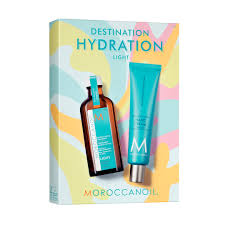 Kosteuttava unelmaduo! Värikäs tuotepakkaus sisältää Moroccanoil Treatment Light-hoitoöljyn 100 ml sekä -käsivoiteen 100 ml.