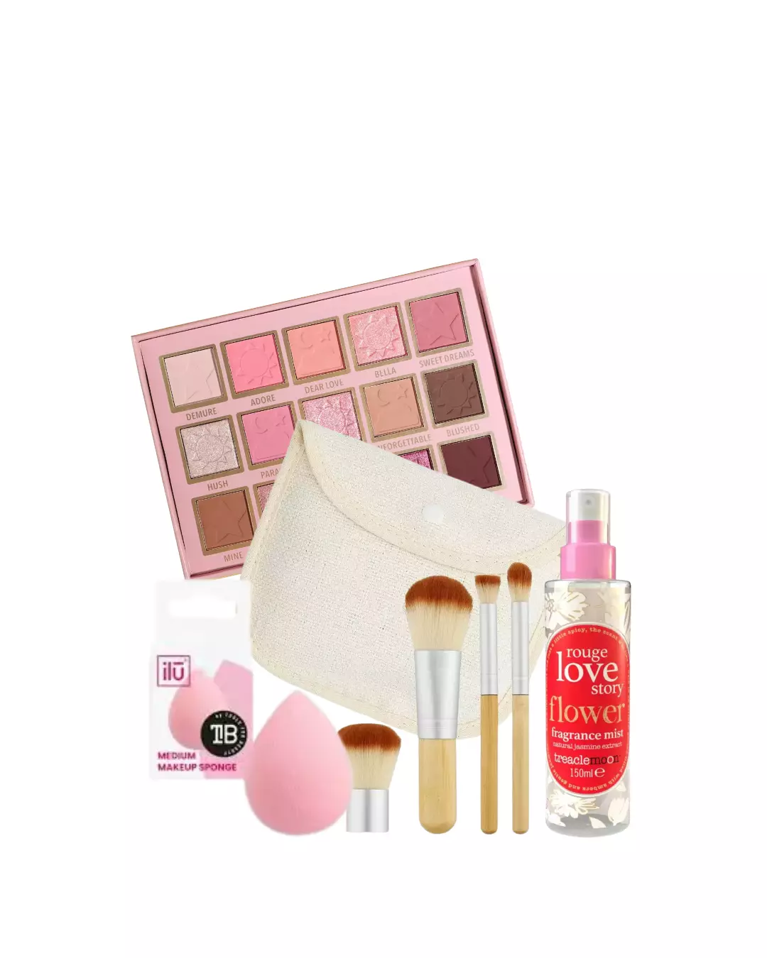 1. Moira Celestial Love Pressed Pigment Palette - luomiväripaletti on inspiroitunut tähtien loisteesta ja taivaallisesta kauneudesta, tuoden silmämeikkiisi ripauksen taikaa. Tämä paletti sisältää huolellisesti valittuja sävyjä, jotka hehkuvat niin mattaisina kuin hohtavina, täydellisesti toisiaan täydentäen. Runsaspigmenttinen ja samettinen koostumus tekee levittämisestä helppoa, luoden saumattoman ja pitkäkestoisen lopputuloksen. 2. ILU Make-up Sponge Raindrop Medium Pink - Meikkisieni sopii ihanteellisesti voidemaisten ja nestemäisten tuotteiden levittämiseen. 3. Mimo Meikkisivellinsetti Bamboo - 4 matkakokoisen siveltimen setti, jotka on valmistettu synteettisistä harjaksista ja joissa on bambukahva. Setin mukana tulee puuvillapussi. 4. Treaclemoon Rouge Love Story Body Spray 150ml - Vartalosuihke kietoo vartalosi tuoksulla, joka on vähän makea ja vähän tulinen. Tuoksu on kuin kävelisit itämaisessa puutarhassa, joka on täynnä ambraa ja lempää jasmiinia. Sisältää luonnollista jasmiiniöljyä. Vartalotuoksu on vegaaninen.