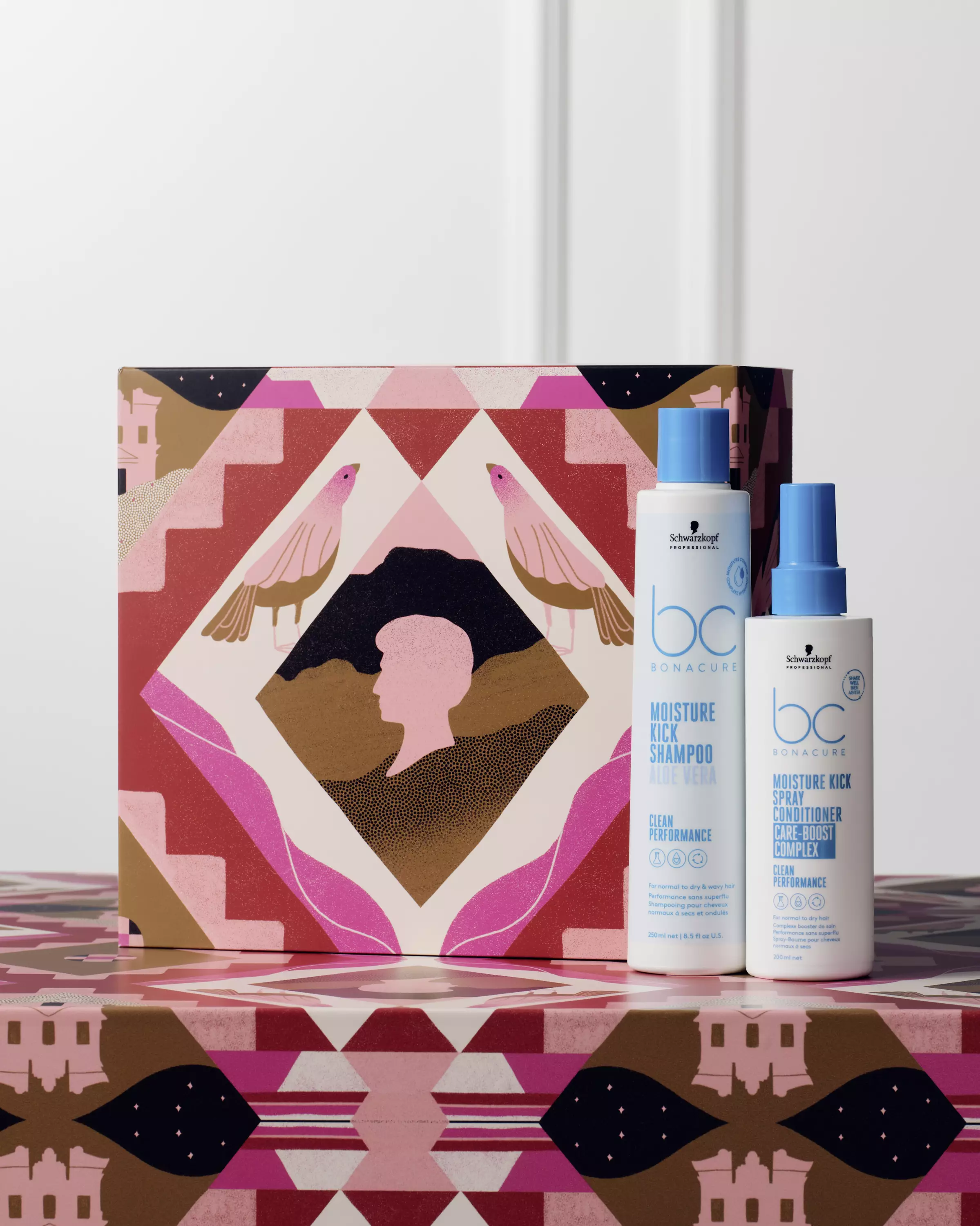 Paketissa: Bonacure Moisture Kick Shampoo 250ml ja hoitosuihke 200ml. Kaunis rasia, jota voi käyttää myöhemmin esim. korujen säilytykseen.