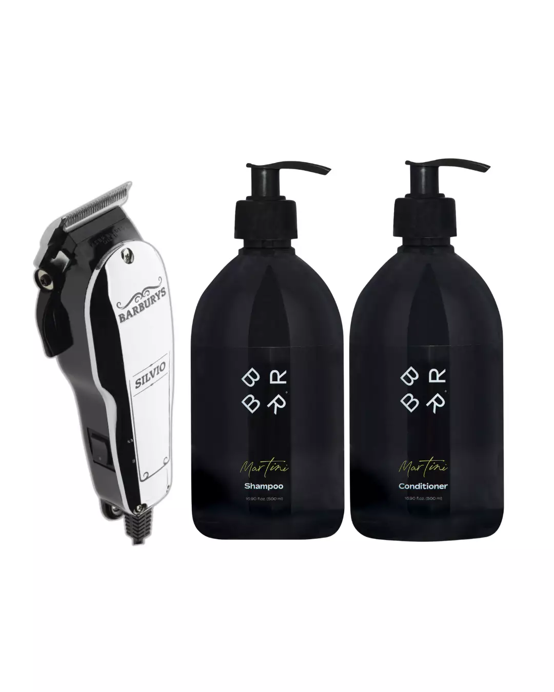 1. BRBR Martini Shampoo 500ml - Klassikkodrinkin tuoksulla höystetty laadukas, ammattilaisten suunnittelema ja käyttämä BRBR Martini shampoo. Koivua, nokkosta ja aloe veraa sisältävä shampoo pesee tehokkaasti samalla kosteuttaen, virkistäen ja hoitaen hiuksia ja hiuspohjaa. Sisältää UV-suojan ja stimuloi hiuspohjan pintaverenkiertoa. Sopii päivittäiseen käyttöön. 2. BRBR Martini Conditioner 500ml - Klassikkodrinkin herkullisella tuoksulla höystetty laadukas, ammattilaisten suunnittelema ja käyttämä hoitoaine. Tehokkaasti hoitava BRBR Martini Conditioner sisältää UV-suojan, parantaa kammattavuutta, vähentää sähköisyyttä ja tekee hiuksista helposti käsiteltävät. Sisältää hiuksia kosteuttavaa Pro-vitamin B5:tä sekä virkistävää ja ihon pintaverenkiertoa edistävää mentolia. Sopii päivittäiseen käyttöön. 3. Barburys Clipper Silvio Vintage - Barburysin Silvio-hiusleikkuri on tehokas, vaativaan käyttöön suunniteltu johdollinen leikkuri. Sen magneettimoottorin ansiosta leikkuri on ihanteellinen jatkuvaan käyttöön.Kätevän peukalovivun avulla voit säätää leikkuukulmaa ja tekstuuria ilman, että teriä tarvitsee vaihtaa. Tyylikkään Silvio-leikkurin ergonominen muoto istuu mukavasti käteen. Korkeahiiliteräksinen terä (< 46 mm) takaa tarkan rakenteen, lisäterävyyden ja kestävyyden. Takuu 6kk.