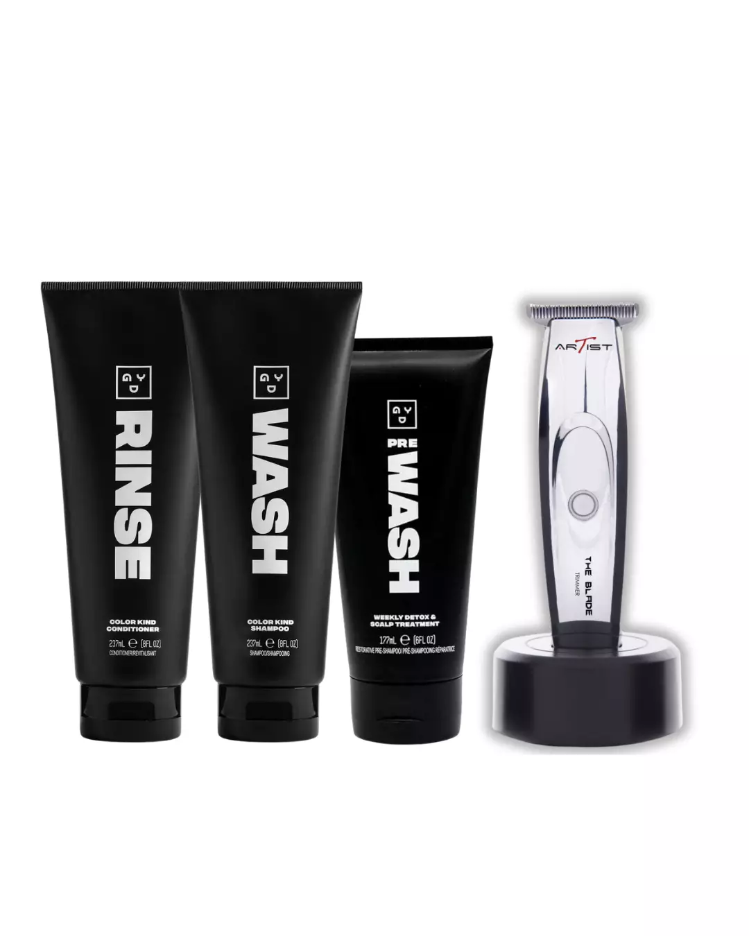 Paketissa: Good Dye Young Wash Shampoo 237ml, Good Dye Young Weekly Detox & Scalp Treatment 177ml, Good Dye Young Rinse Conditioner 237ml ja Artist The Blade Trimmer.