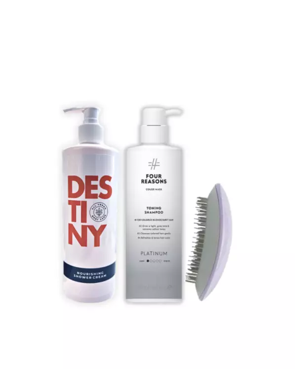 1. Four Reasons Color Mask Toning Shampoo Platinum 500ml - Sävyttävä shampoo vaaleille ja harmaille hiuksille. Väripigmentit antavat viileän, kevyen hopeisen vivahteen, ehkäisevät hiusten kellastumista ja ylläpitävät hiusväriä. Puhdistaa värjätyt hiukset hellävaraisesti, valmistettu ilman sulfaatteja.Poistaa tehokkaasti sähköisyyttä ja antaa kiiltoa. Käyttöohjeet: Hiero shampoota kämmenten välissä, vie kosteisiin hiuksiin ja vaahdota. Anna vaikuttaa hetki ja huuhtele huolellisesti. Pidempi vaikutusaika tehostaa sävyä. Käytä perinteisen shampoon sijasta aina, kun hiusvärisi kaipaa virkistystä. Shampoon väri on lopputulosta tummempi. Huomaa, että hiusten huokoisuus, kunto ja nykyinen sävy vaikuttavat lopputuloksen tasaisuuteen. 2. Destiny Nourishing Shower Cream 500ml - Ihoa hellivä suihkusaippua. Virkistävä ja ihoa hoitava suihkusaippua. Tämä ainutlaatuinen ihoa hellivä suihkusaippua pesee tehokkaasti, mutta hellävaraisesti. Sisältää E- ja A-vitamiinia. Sopii kasvojen ja koko vartalon pesuun. Pirteän raikas appelsiinin tuoksu. 3. Tangle Mouse Lavender/Silver - Täydellinen harja selvittämään hiuksesi kivuttomasti ja helposti. Harja ei vahingoita hiuksiasi ja sopii kaikille hiustyypeille.