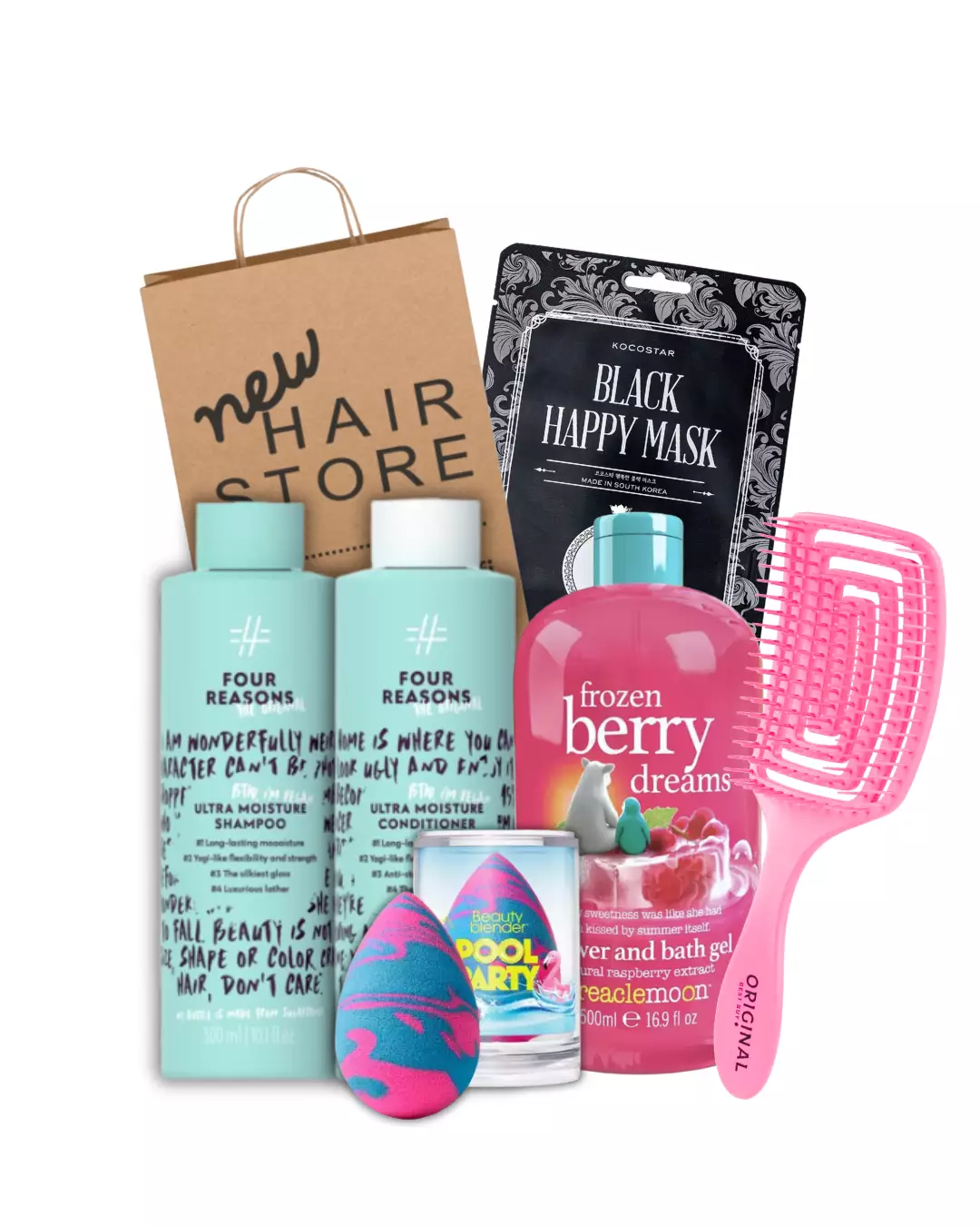 Paketissa: Four Reasons Original Ultra Moisture Shampoo 300ml, Four Reasons Original Ultra Moisture Conditioner 300ml, Original Eco Brush pinkki, Treaclemoon Frozen Berry Dreams Shower Gel 500ml, Beautyblender Pool Party ja Kocostar Black Happy Mask.