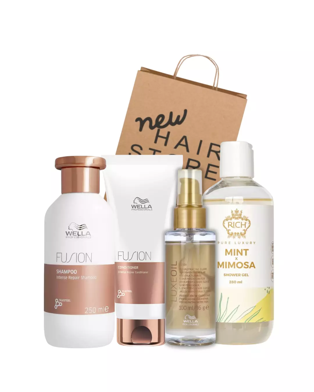 1. Wella Fusion Intense Repair Shampoo 250ml - Hoitava shampoo, joka vähentää harjaamisesta ja hiusten muotoilusta aiheutuvaa rasitusta. Hellävarainen shampoo auttaa korjaamaan vaurioituneet hiukset ja tekee hiuksista puhtaat ja hoidetut. Sisältää EDDS-teknologian, joka poistaa metallisia epäpuhtauksia antioksidanttien avulla lisäksi koostumus sisältää mikronisoituja lipidejä ja silkkiaminohappoja. 2. Wella Fusion Intense Repair Conditioner 200ml - Hoitoaine, joka korjaa vahingoittuneita ja haaroittuneita hiuksia. Hoitoaine, joka korjaa vahingoittuneita ja haaroittuneita hiuksia. Se sisältää silkkiaminohappoja ja mikrolipidejä, jotka korjaavat hiuksia ja suojaavat niitä kulumiselta ja vahingoittumiselta. Hoitoaine tekee hiuksistasi puhtaat, pehmeät ja hoidetun tuntuiset. 3. Wella SP Luxe Oil 100ml - Keratiinipohjainen hiusöljy antaa hiuksille kosteutta ja keratiinia. Hieno jälleenrakentava hiusöljy joka tuo hiuksiisi uutta rakennetta. Argania-, jojoba- ja manteliöljyä sisältävä sekoitus imeytyy hiusten rakenteeseen ja muuttaa sen sisältä käsin, suojaten keratiinia. Hiusöljy korjaa auringon tai kemiallisten käsittelyjen vaurioittamia hiuksia tehokkaasti. Saat välittömästi pitkäkestoisen sileät, taivaallisen kiiltävät ja hyvinvoivat hiukset! 4. Rich Pure Luxury Mint & Mimosa Shower Gel 280ml - Uudista suihkurutiinejasi ja koe ylellinen suihkukokemus Mint & Mimosa- suihkugeelillä. + lahjakassi